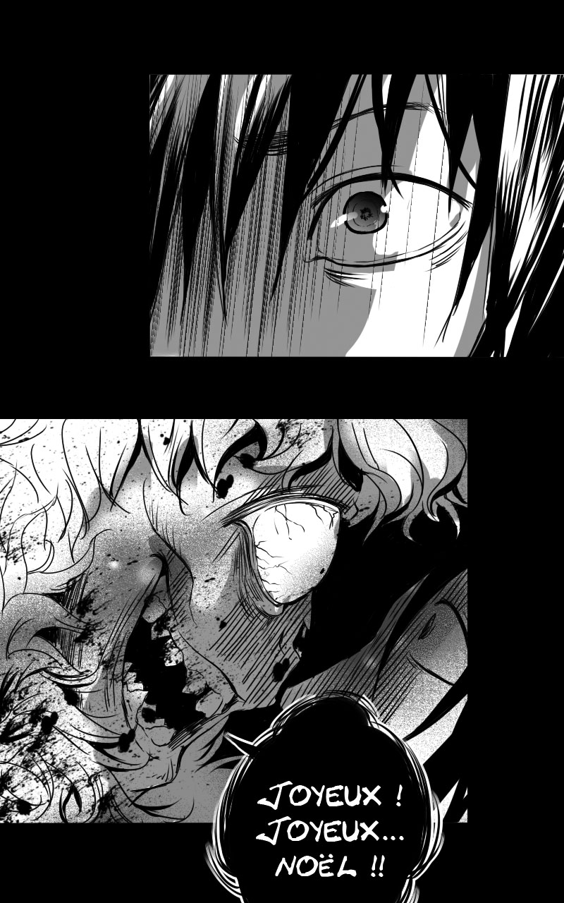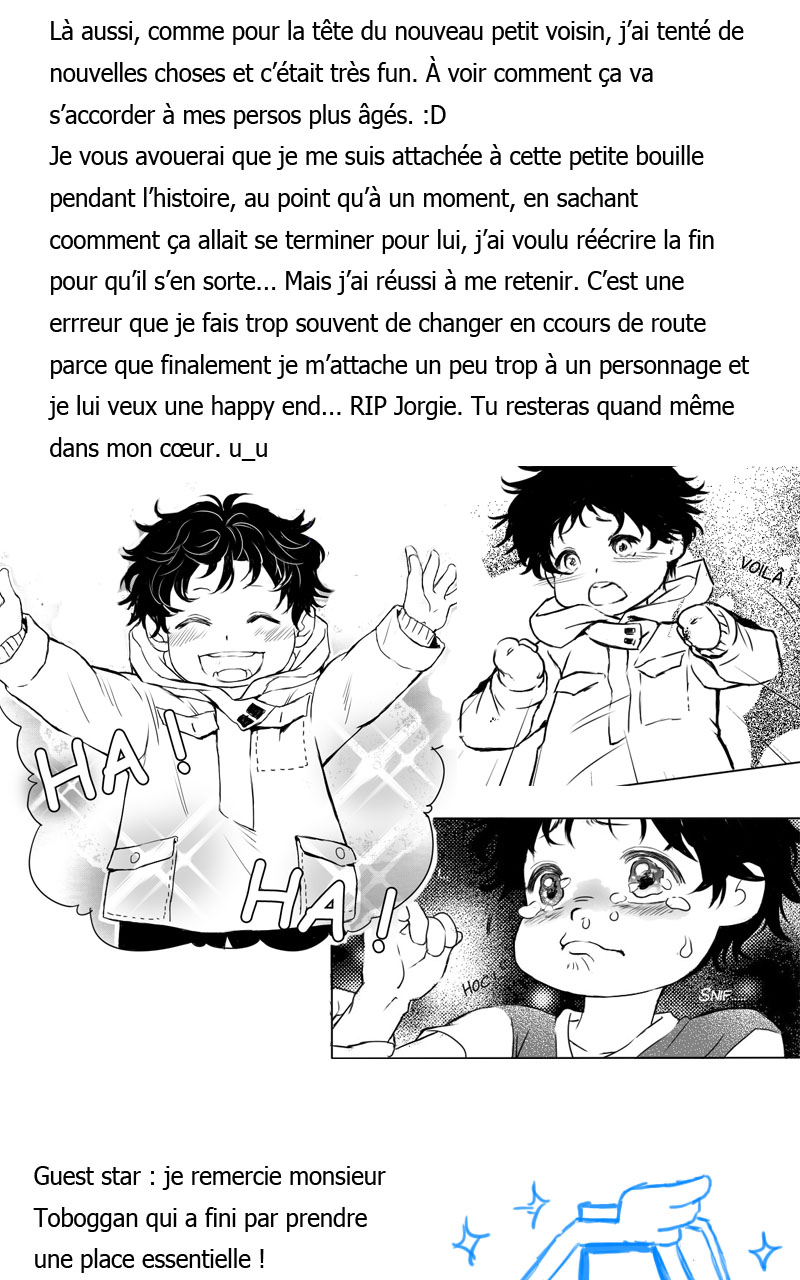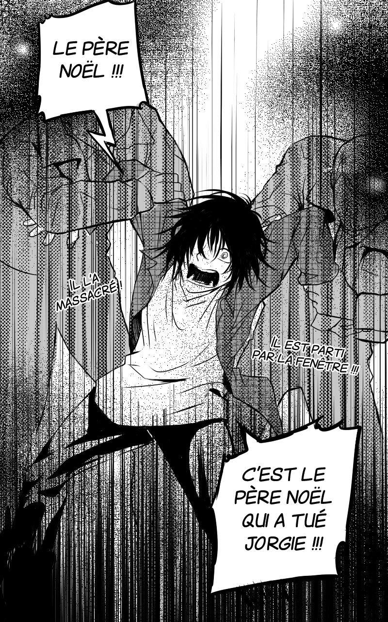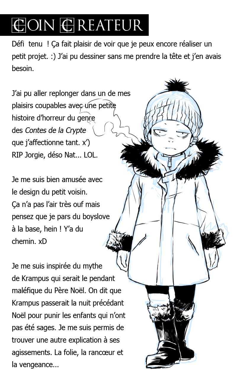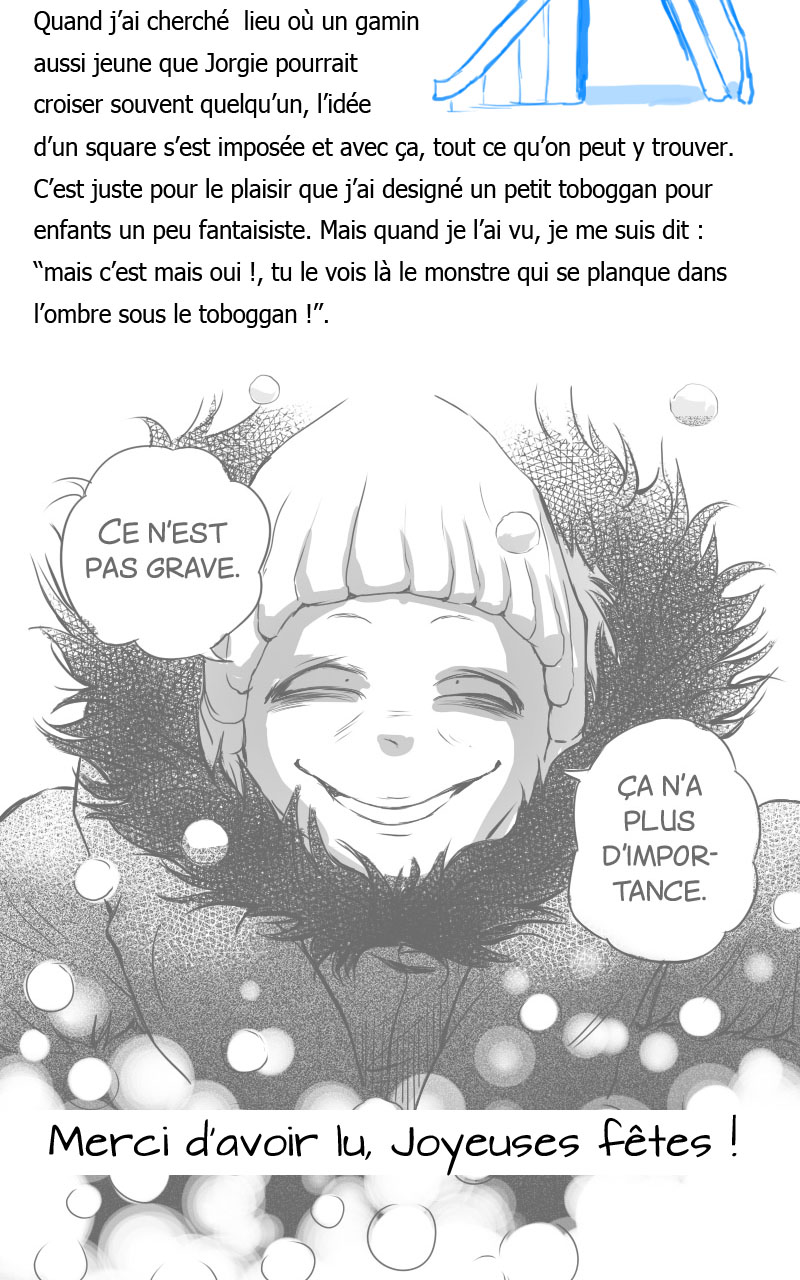Après, je me suis rappelée que Jorgie est un petit enfant, encore très naïf, il n’avait pas encore l’expérience pour se méfier ni le caractère pour voir le Mal. Cette gentillesse et cette confiance sont trahies par une créature folle, c’est le monstre qu’il faut blâmer. >_< Les méchons !!! TAT Merci d'avoir lu et pour on retour ! Ça me fait plaisir ! 😀 Joyeuses fêtes ! xDDDD