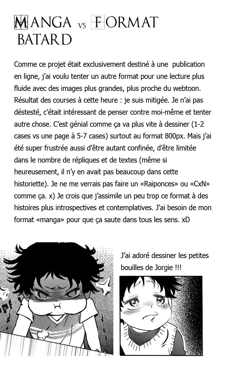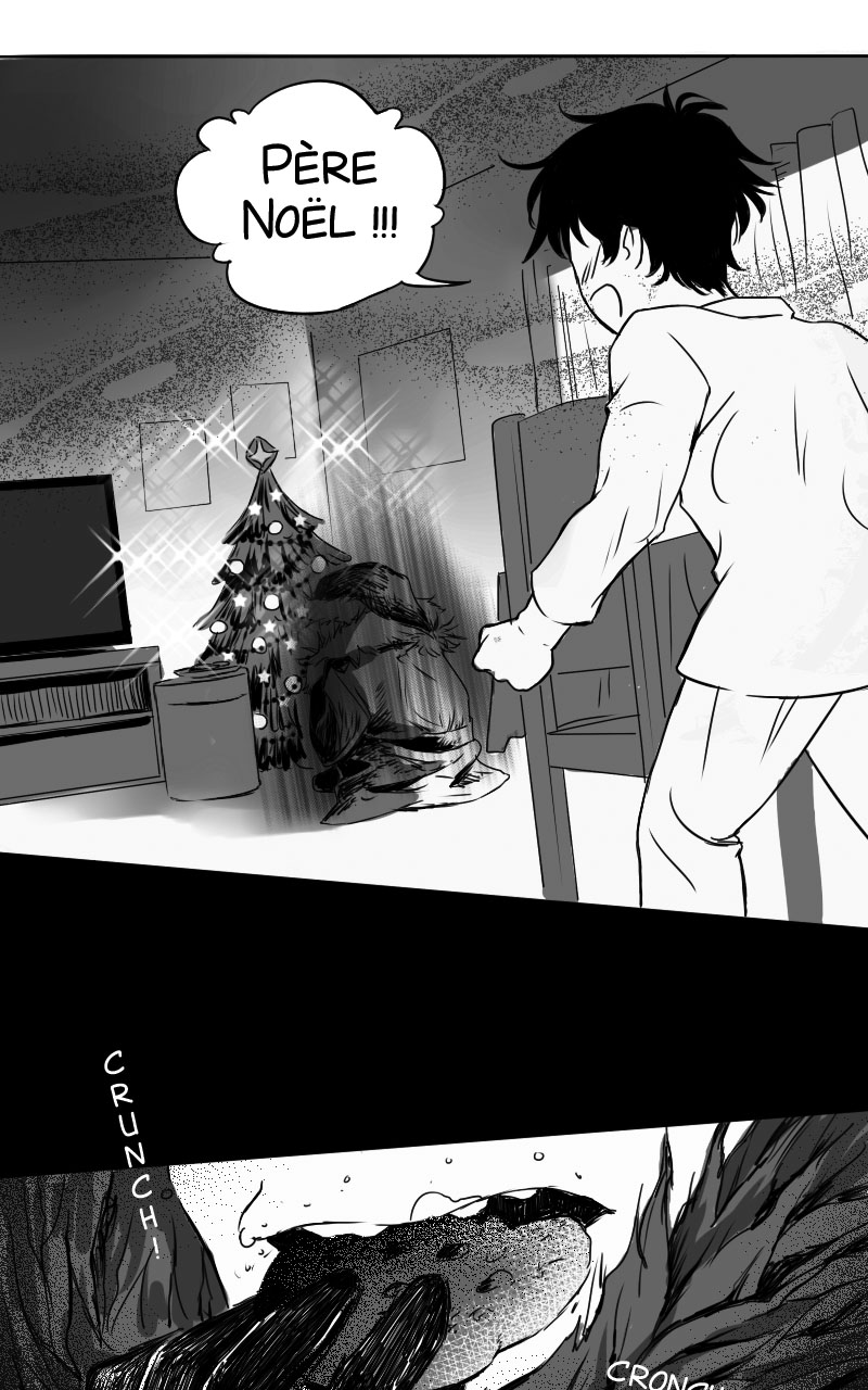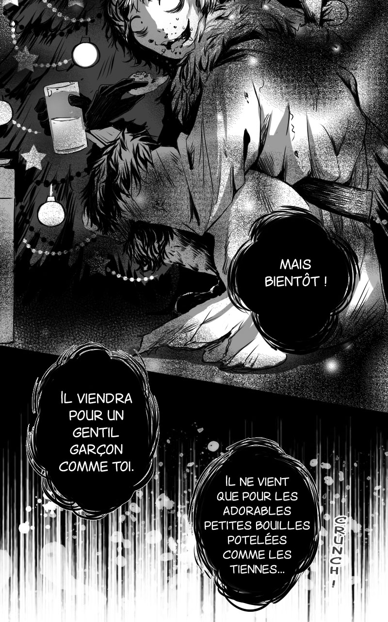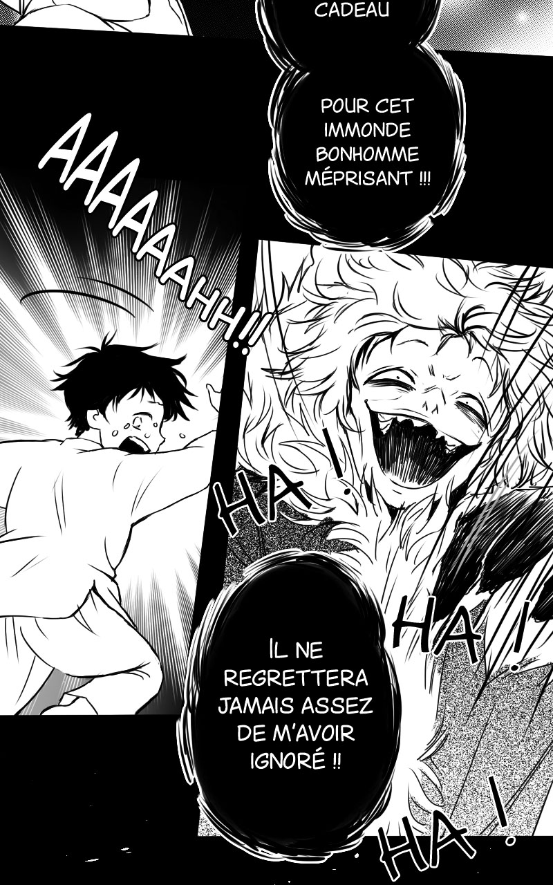 Après, je me suis rappelée que Jorgie est un petit enfant, encore très naïf, il n’avait pas encore l’expérience pour se méfier ni le caractère pour voir le Mal. Cette gentillesse et cette confiance sont trahies par une créature folle, c’est le monstre qu’il faut blâmer. >_< Les méchons !!! TAT Merci d'avoir lu et pour on retour ! Ça me fait plaisir ! 😀 Joyeuses fêtes ! xDDDD